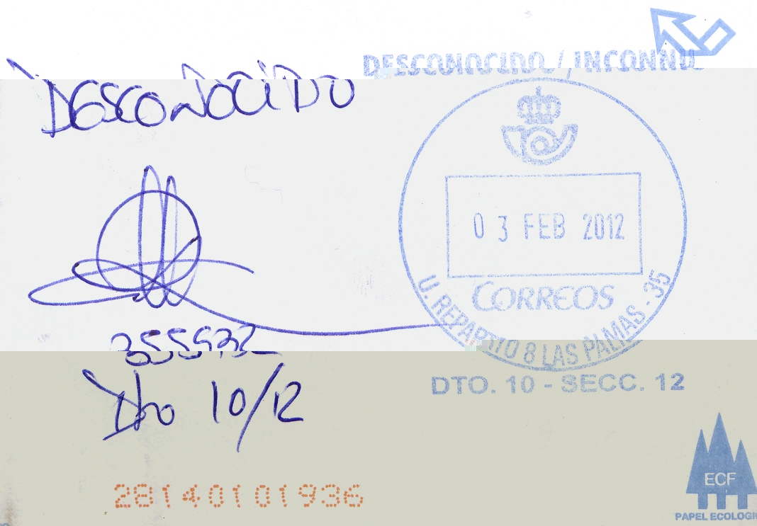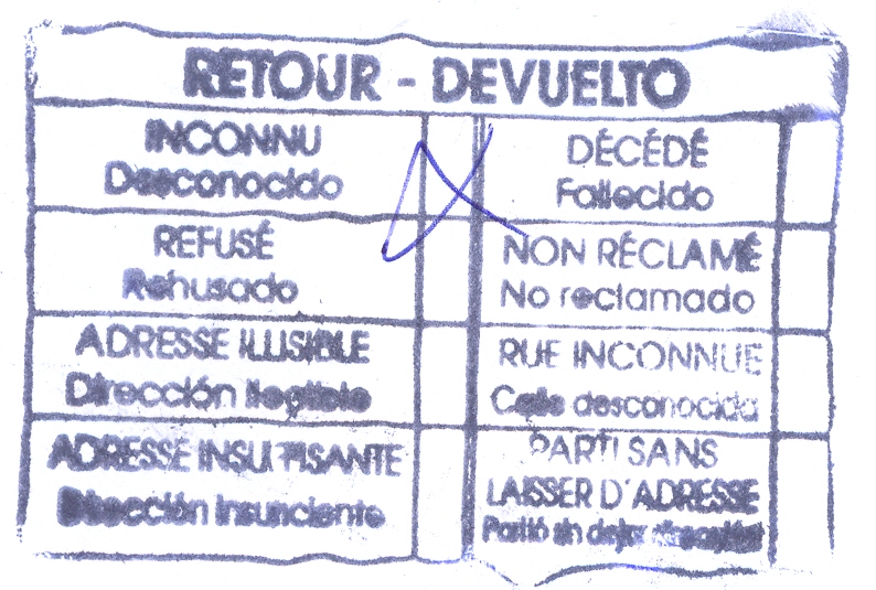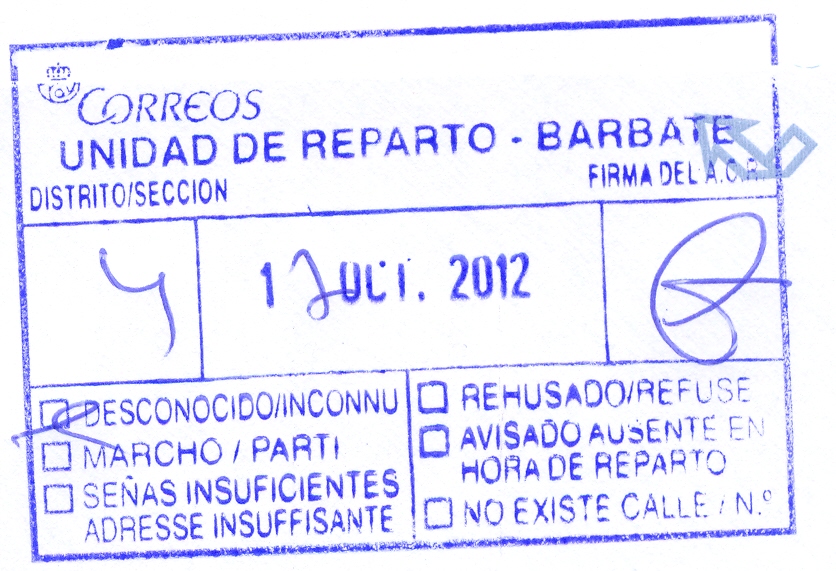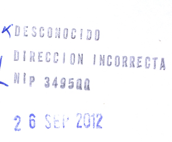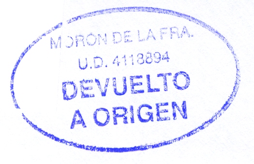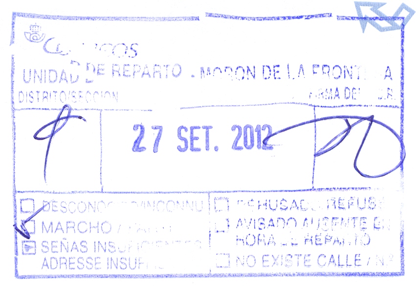 sin título (color azul), para indicar las causas de la devolución, (utilizada en Olot, Gerona, el 17/10/2012)
