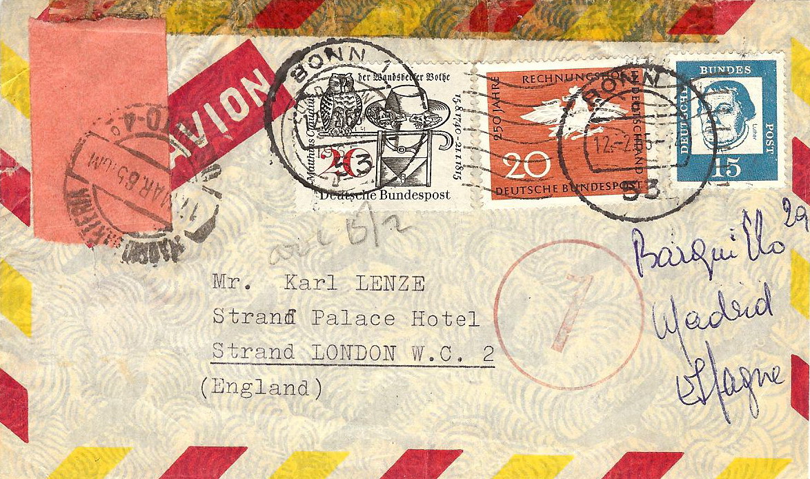 Porque, sin duda, la carta que presento está preparada. En el remite bajo la cinta de adhesiva decolorada se puede leer "LENZE, Barquillo 29, Madrid" (Carlos Lenze fue un conocido filatelista y comerciante) y va dirigida a "Karl LENZE" en un hotel de Londres. Pero se envía desde Bonn (Fechador del 12 de febrero de 1965).