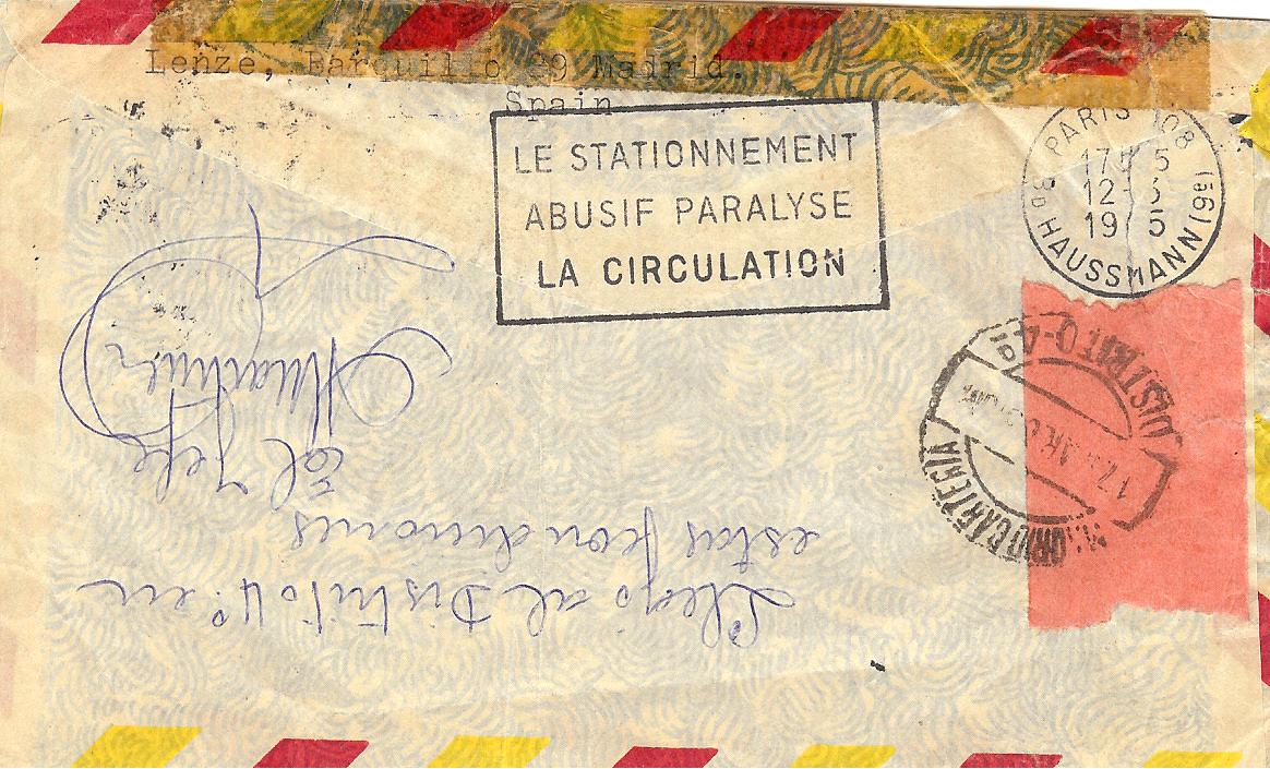 La cuestión es que la carta devuelta llega a Madrid en mal estado y en la sucursal 4 se escribe al reverso de forma manuscrita "Llegó al distrito 4º en estas condiciones" y la firma de "El Jefe". Se acompaña con dos fechadores (17 de marzo de 1965 al anverso y reverso) sobre cierres que seguramente han sido puestos en la oficina para reparar cortes del sobre que se ve rasgado. En el reverso una "flamme" de París (12 de marzo) nos habla de que el estacionamiento abusivo paraliza la circulación y nos permite comprobar que la devolución a Madrid no se hizo por avión.