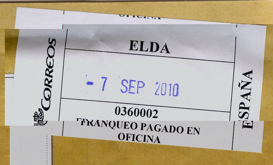 Con la particularidad de estar realizada mediante una etqiueta fabricada por la propia oficina y con un fechador para la fecha.