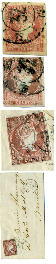Por lo poco que se puede ver el primero es del tipo II, y se encuentra circulado en frontal de Málaga a Cádiz de 29 de abril de 1856, o sea, que el defecto venía desde bastante el principio.