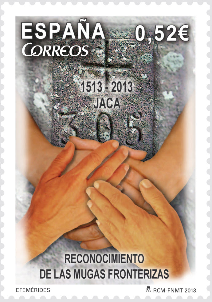 Con este sello dedicado al Reconocimiento de las mugas fronterizas 1513-2013 se recuerda el tratado de vecindad, amistad, ayuda mutua, protección y aprovechamiento de los pastos, pasos y aguas entre los valles pirenaicos de Aragón y Francia.