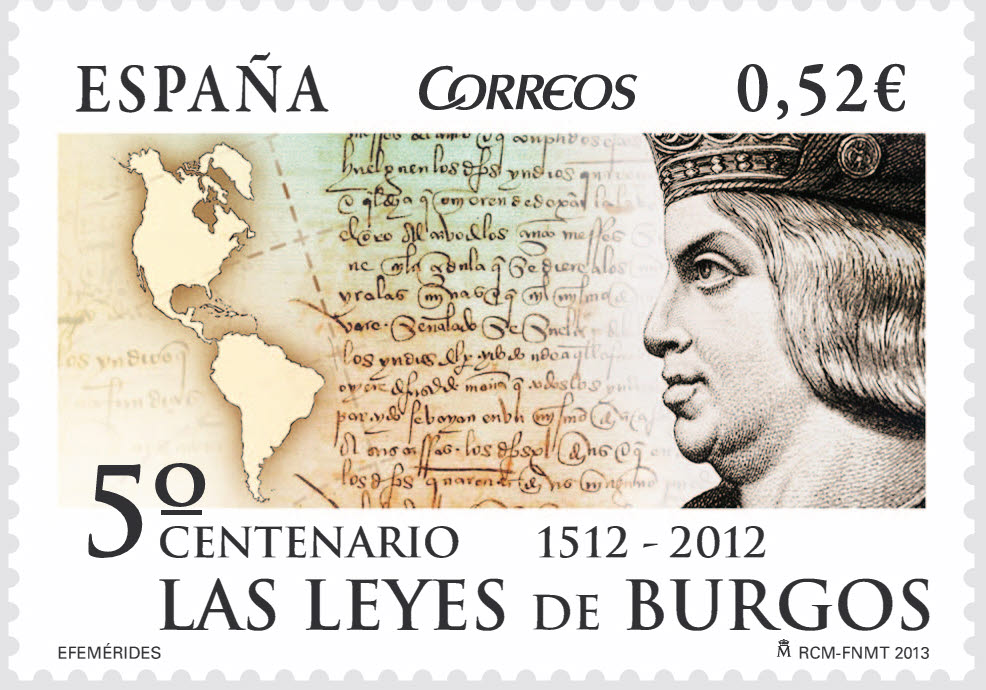 Con motivo del V Centenario de la Promulgación de las Leyes de Burgos, se emite un sello en el que aparece una imagen de Cristóbal Colón, descubridor de América, un párrafo del texto y el mapa del continente americano al que se aplicaron las normas jurídicas.