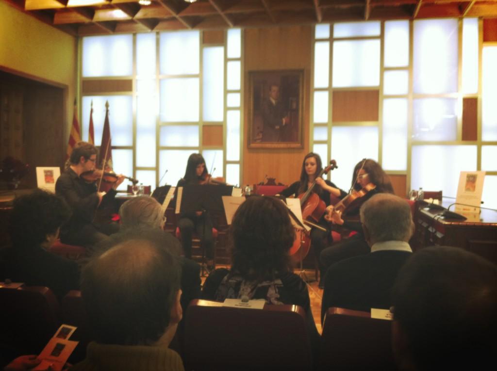 Adjunto dos fotos del acto: mesa presidencial e interpretación de una partitura por parte de un cuarteto de cuerda, aunque en ninguna de ellas se aprecia matasellos alguno.