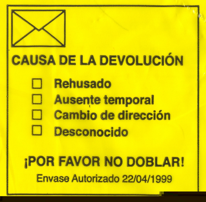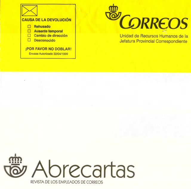 La bolsa de plástico (Envase Autorizado 22/04/1999) sirve para enviar la revista Abrecartas, Revista de los Empleados de Correos y, en caso de devolución, se remite a la Unidad de Recursos Humanos de la Jefatura Provincial Correspondiente.