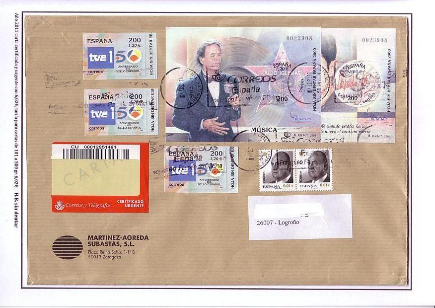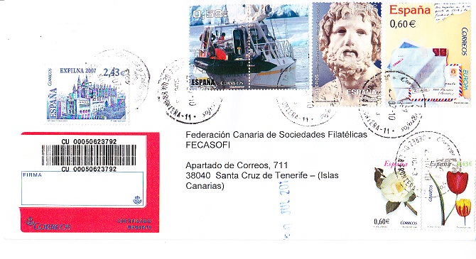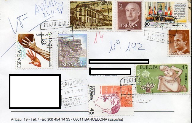 Una curiosidad. La empleada de Correos de aquí de Cúllar Vega, cuando me ve llegar ya sabe si tengo algún certificado precisamente por los franqueos, a los que ella llama "bonitos y sobre todo llamativos"; "Cuando veo un franqueo de éste tipo ya se que es para tí, y no tengo que buscar por el aviso de llegada, ya se cual es el tuyo".