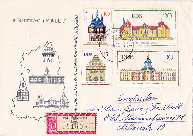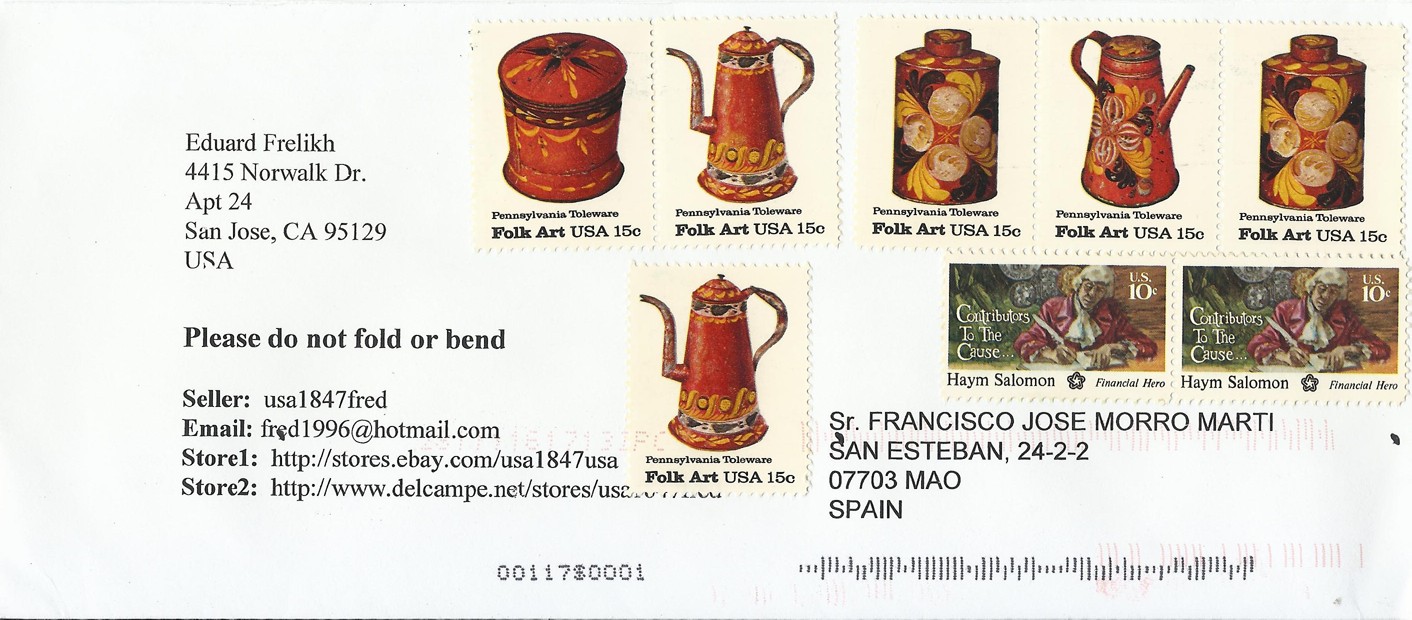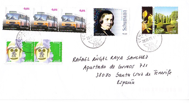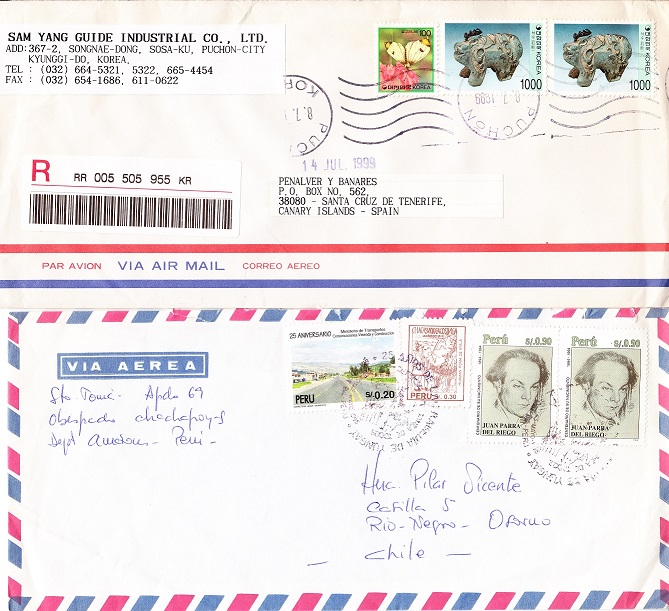 Uno muy filatelico y otro multifranqueado, mucho más reciente en el tiempo, con insuficiencia en el franqueo (observar los sellos que están pegados por encima del rodillo manual).