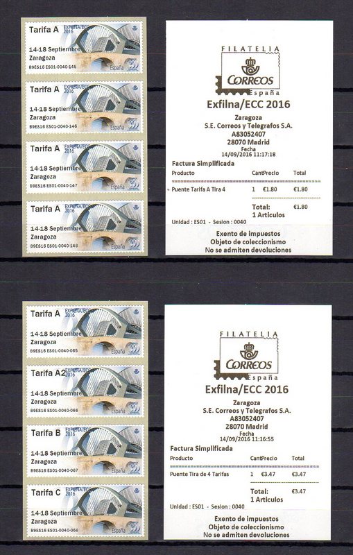 ATM´s Zaragoza Puente, serie cuatro valores tarifa A y serie cuatro tarifas con sus recibos