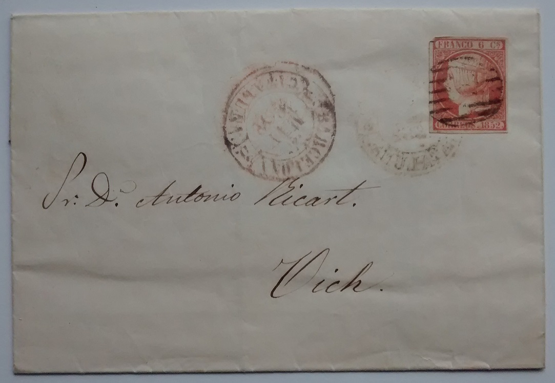 Carta 1852 con Baeza de Barcelona y 6 cuartos de 1852 cancelado con parrilla