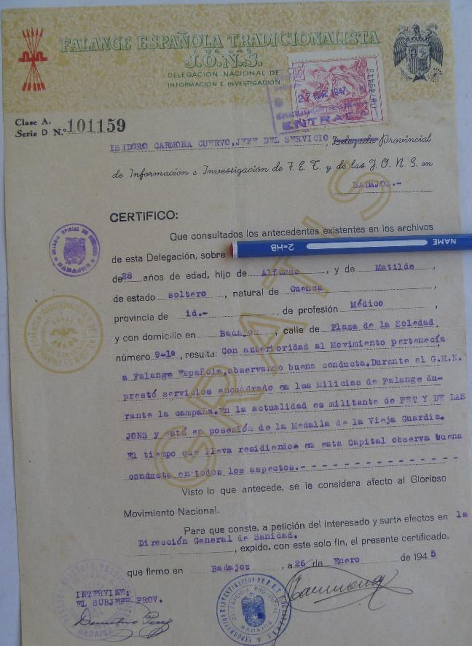 Está confeccionado en Badajoz el 26 de enero del año 1948.