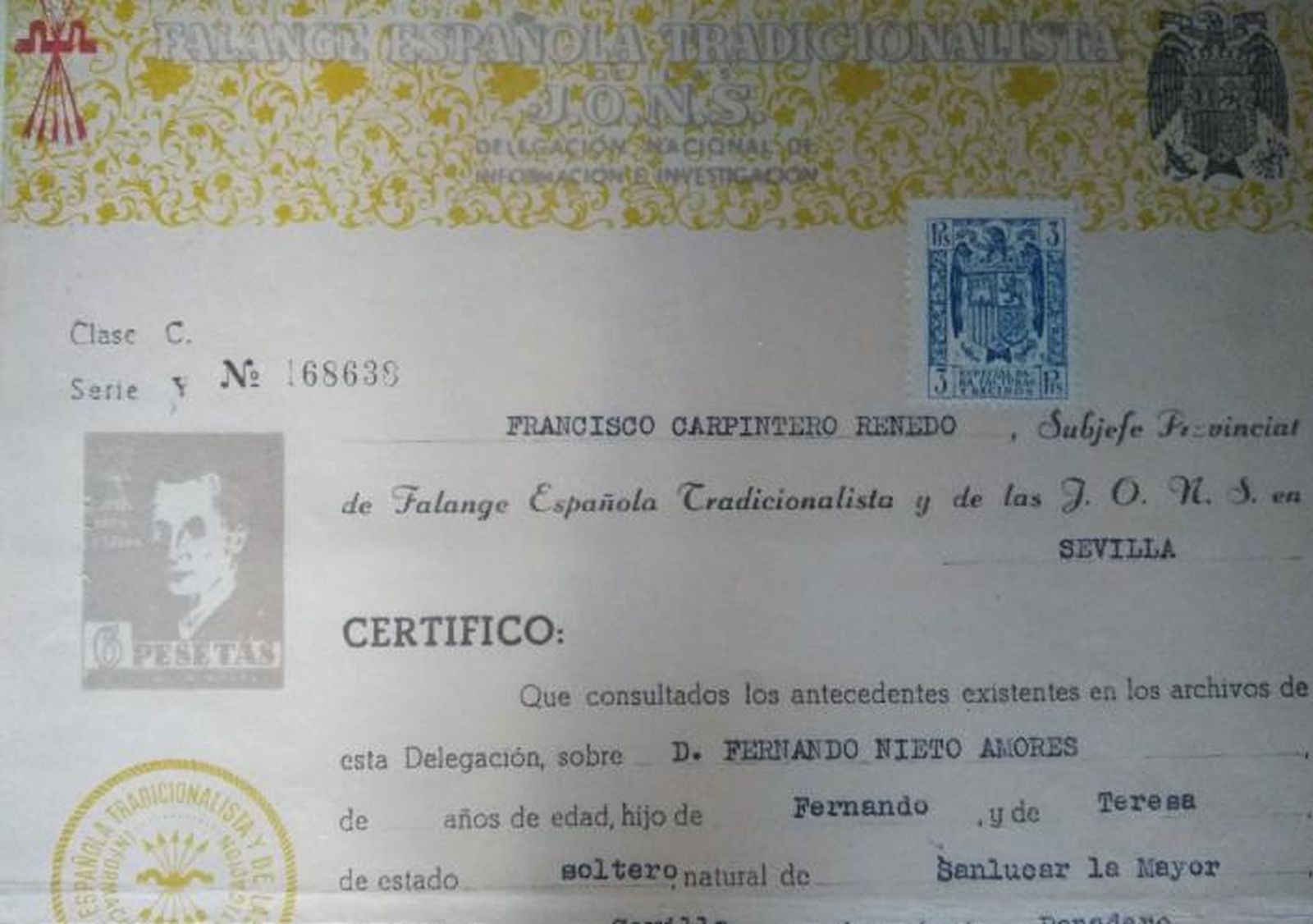 Este caso es un impreso de Certificado de la Falange Española Tradicionalista y de las J.O.N.S. Delegación Nacional de Información e Investigación por el que se certificaba que la persona indicada no pertenecía a F. E. T. y de las J. O. N. S.