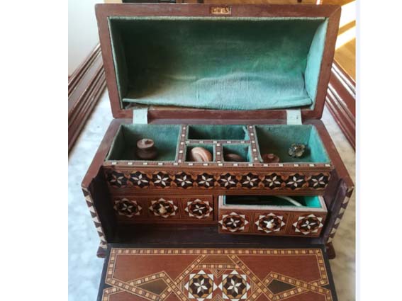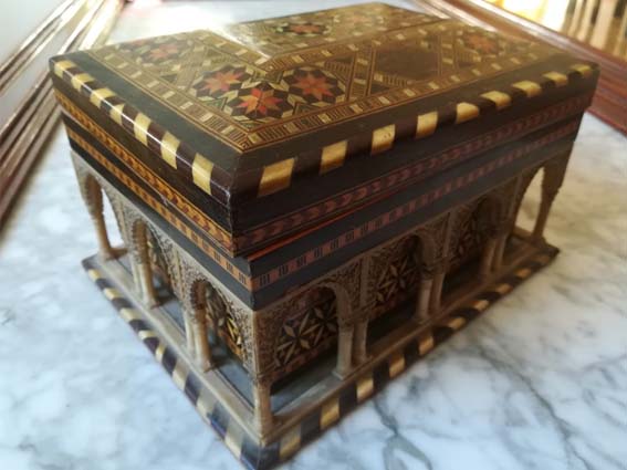 Selección de antiguas cajas árabes de taracea, antigua tradición que aún se conserva en Granada y en el mundo árabe musulmán, como Siria y Egipto, que cuentan con una larga tradición. Esta antigua técnica artesanal de revestimiento de objetos, utiliza pequeños fragmentos cortados de distintos tipos de madera, nácar, conchas o marfil, incrustados manualmente en el recubrimiento de las cajas, al modo de los mosaicos, creando un diseño decorativo con el efecto de contraste del color y características del material empleado. La colección recrea motivos y arquitectura árabes e incluye palabras del Corán.