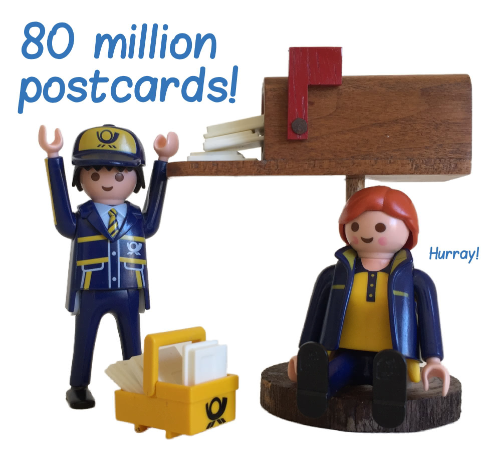 Además, estamos celebrando este hito casi exactamente 2 años después del último gran hito (70 millones), por lo que parece que nuestra trayectoria sigue siendo muy estable, con una media de 5 millones de postales al año. ¡Lo cual es simplemente brillante!