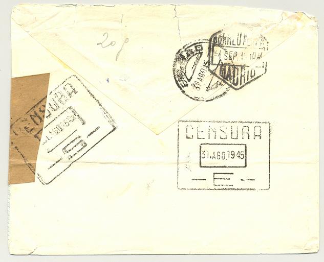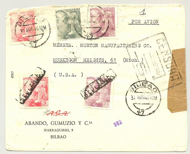 Carta aérea de Bilbao a Michigan (USA) con fechador de salida 31/ago/45 12M. Franqueada originalmente con 4,65 pts + 4,25 pts en franqueo reclamado (que creo es lo que pone el matasellos). Marcas de la censura de entrada/salida, y fechador aéreo de Madrid del 01/sep/45, al dorso. El peso, 20 gramos, manuscrito a lápiz, también al dorso.