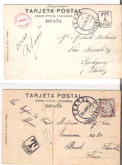 En tu carta de Coruna a Liège, los 10 centimos se condideraron en Belgica como nulos, y la carta tasado al doble sean 20 centimes belgos.