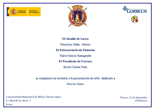 Invitación al acto de presentación de la serie dedicada a Narciso Yepes en Lorca 11 de Septiembre.