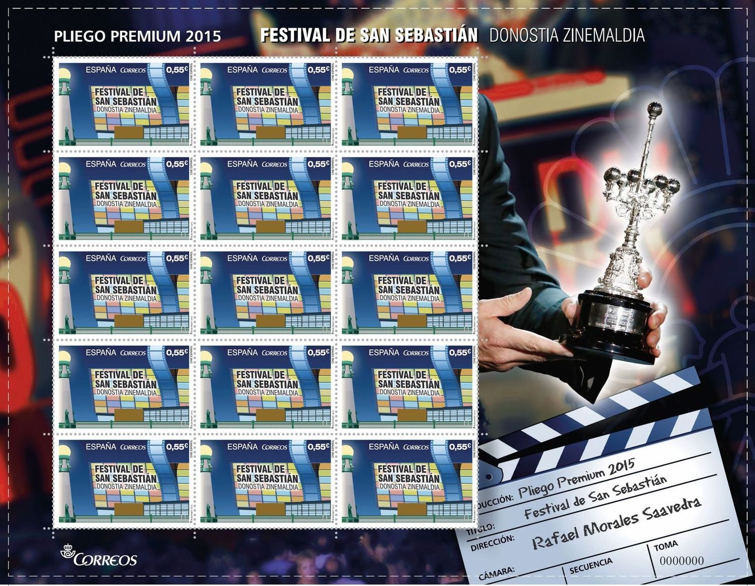 El Festival de San Sebastián o Donostia Zinemaldia, en euskera, toma el protagonismo de la serie “Cine Español” que se presenta en formato Pliego Premium. En el sello figura el Palacio de Congresos del Kursaal, sede principal del festival, y una tira de fotogramas impresa en foil para darle mayor luminosidad. En el exterior del pliego se incluye una imagen del Premio Donostia, instituido en 1986 como homenaje a las grandes figuras del cine por su trayectoria profesional. Asimismo, permite personalizar el pliego con los nombres y apellidos de los interesados que lo solicitaron, integrándose los mismos en el diseño de una claqueta de cine como si de una producción audiovisual de rodaje se tratara.
