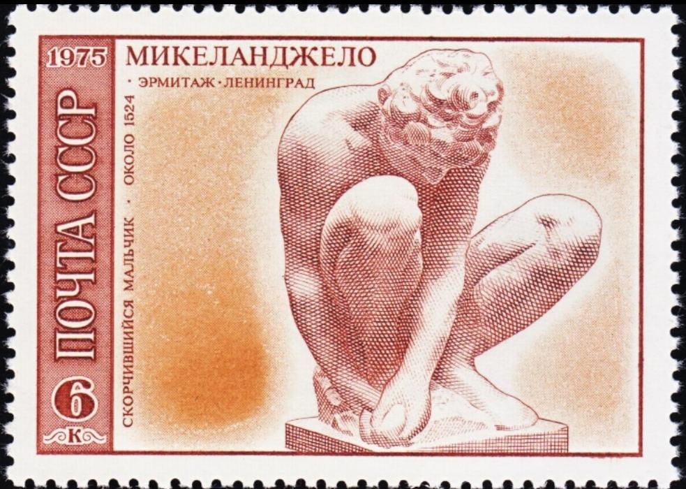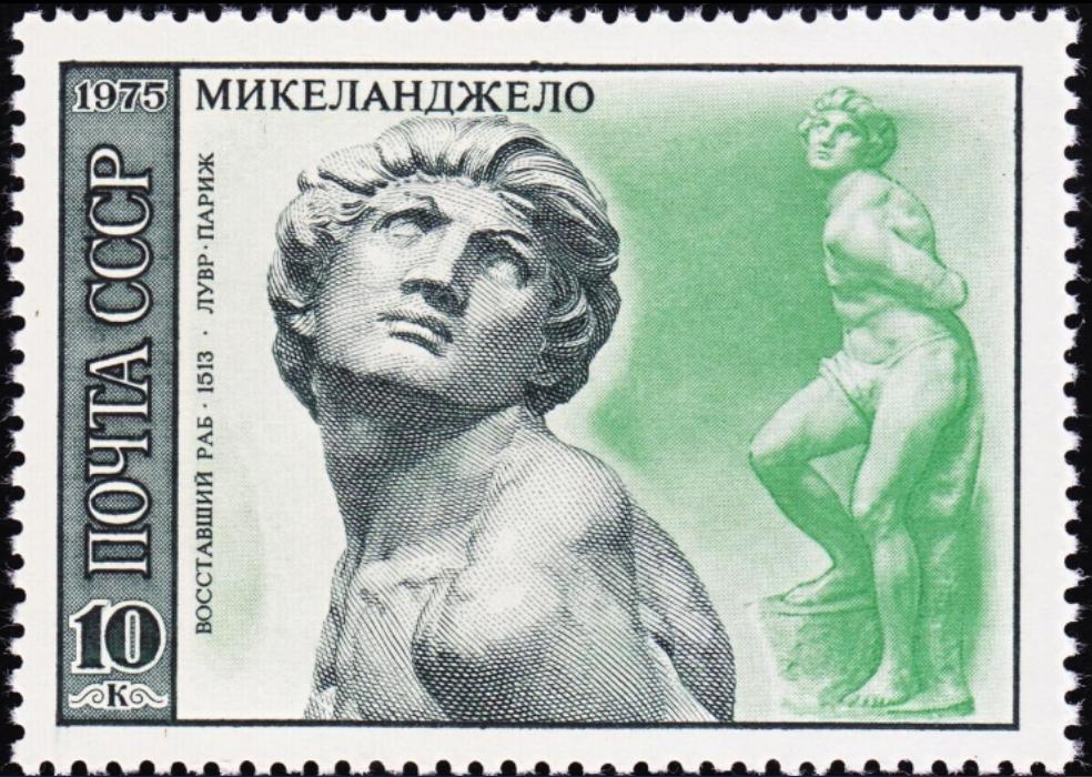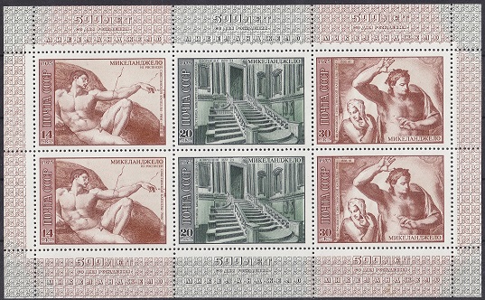 Esta es una hoja bloque de la antigua Unión Soviética, conmemorativa del 500 aniversario de MIGUEL ANGEL.