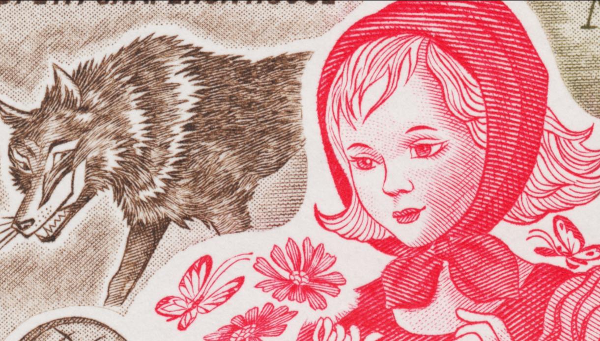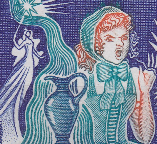 Coincido contigo Rafael, magnífica esta serie para honrar a Perrault. La serie fue emitida por Mónaco en 1978 y participaron en ella cuatro grandes grabadores: Claude Jumelet, Jean Pheulpin, Jacky Larrivière y Eugène Lacaque. Cada uno de ellos aportó dos grabados, excepto Lacaque, que se encargó de tres sellos, estos que muestro ampliados.