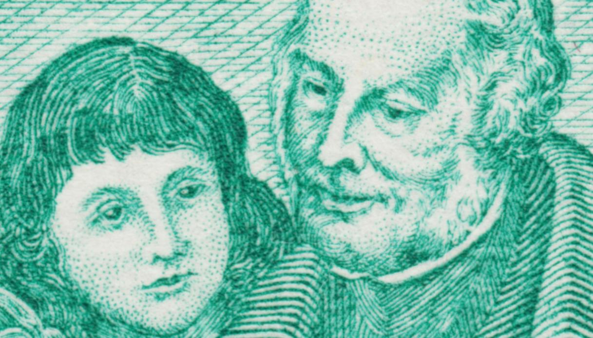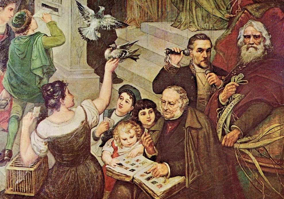 Es un grabado notable de De Bast. El creador del primer sello postal trata de inocular a unos niños el gusanillo de la filatelia. Rowland Hill, creador y apóstol a la vez, es aquí también abuelo entrañable y cariñoso, incitador sosegado a la entrada en un mundo nuevo y apasionante. Una metáfora certera del inicio del coleccionismo y un bello homenaje a nuestra pasión: los sellos.