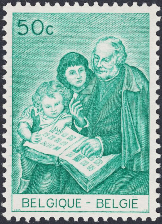 Aprovecho el acicate casual de Quinosollana en el Tema de Ambrosías Postales para mostrar este sello emitido en Bélgica en 1965. Grabado por Jean De Bast, uno de los más grandes grabadores del siglo pasado, el sello muestra a Rowland Hill enseñando a unos niños un álbum de sellos. Está inspirado en una obra de J. E. Van den Bussche para la Oficina General de Correos de Bruselas.