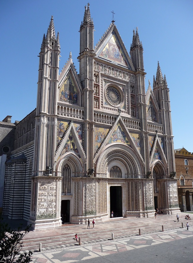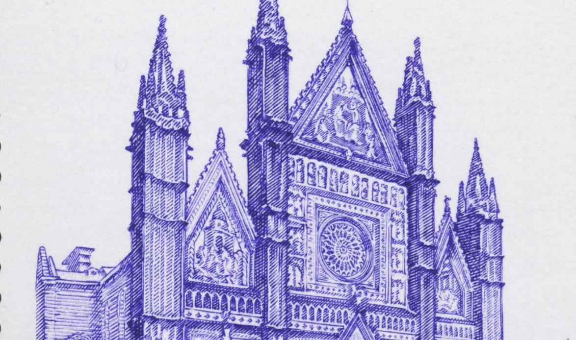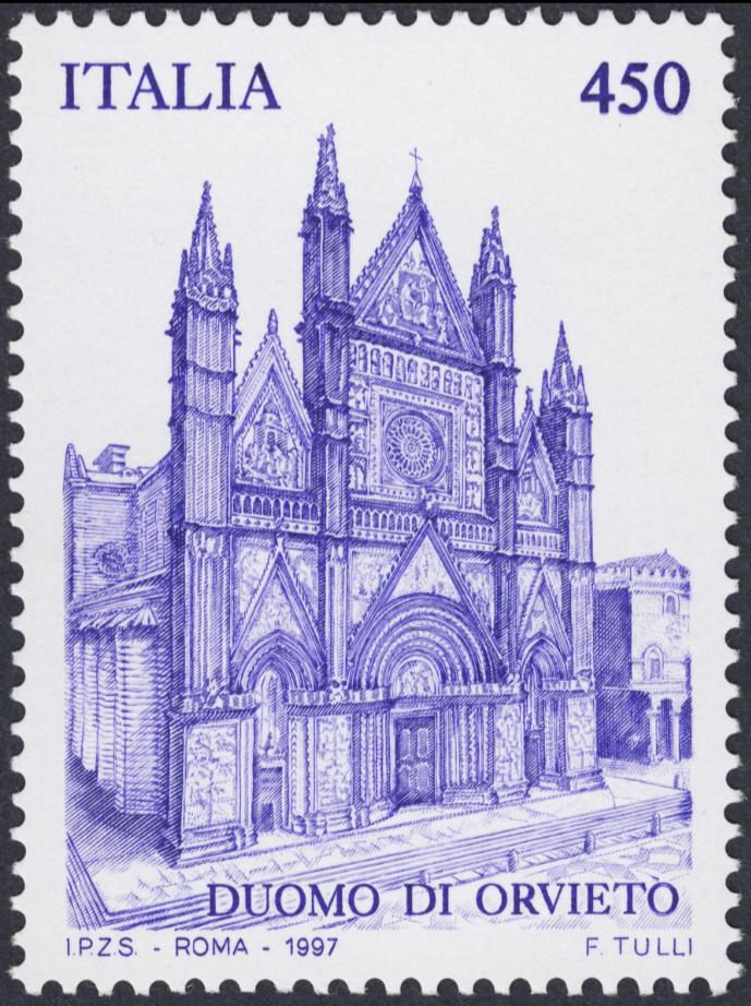 La catedral de Orvieto es una arquitectura gótica de proporciones elegantes del siglo XIV. Francesco Tulli(*) traza con el buril unas líneas briosas y medidas para tallar un grabado de una finura moderada y exquisita. Sello calcográfico emitido por Italia en 1997, ejemplo de concisión artística de un grabador que evoca sin ostentación una obra superior.