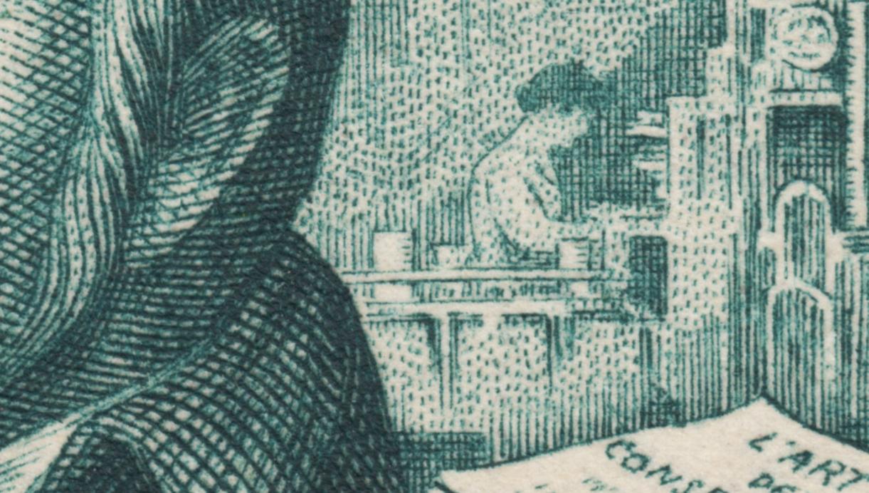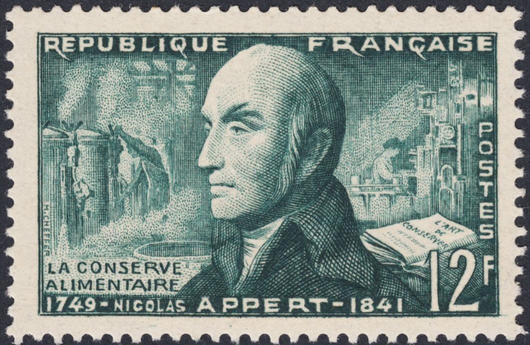 De modo similar, en este grabado de Cheffer la obra de arte está en segundo plano, alejada del foco central, a media luz. En el frontal del sello aparece, severo y formal, el perfil endurecido del inventor Nicolás Appert. Es en la penumbra donde nace la poesía. Es al fondo, en los márgenes formales de la obra, donde hay vida palpitante, agitación, emoción. Allí vemos a un obrero apoyado sobre una máquina refulgente de vapores, sentimos como propia la fatiga sudorosa de este hombre modesto, es sólo una silueta, pero nos duele el hastío amargo de su tarea ingrata. En el otro margen, una mujer sigilosa, apenas perfilada, parece estar poniendo unos frasquitos en una leja con diligencia y pulcritud...