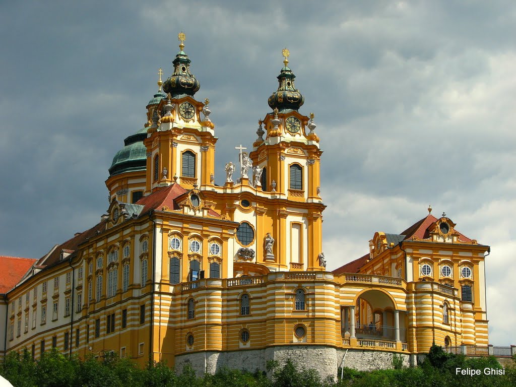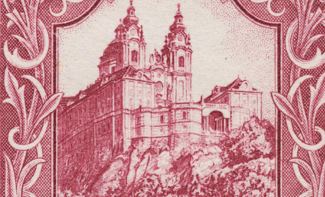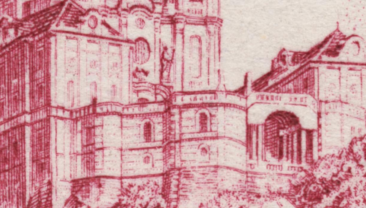 Cuatro páginas atrás mostrábamos la Abadía de Melk de Toth. Exponemos ahora la de Rupert Frank, un grabador austríaco de la generación anterior al que hacemos comparecer aquí por vez primera. Soberbio grabado, más pequeño en tamaño que el de Toth, y por eso mismo de un gran mérito artístico. Sello calcográfico emitido por Austria en 1947: la Abadía de Melk vista desde otra perspectiva. Un grabado fino, diseñado por Ernst Schrom y ejecutado con habilidad y genio.