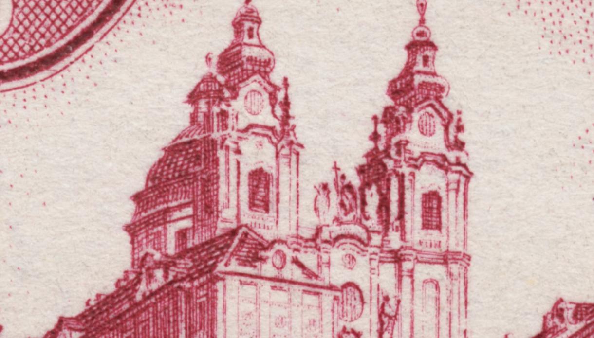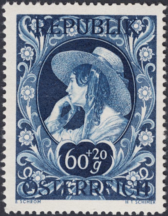 Sello calcográfico emitido por Austria en 1948, diseño a cargo de Ernst Schrom.