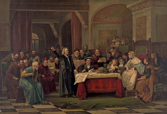 Primero la pintura : una obra del pintor bohemio (antigua región checa) Vaczlav Van Brozik pintada en 1884 y que nos muestra a Colón ante la Corte de los Reyes de España :