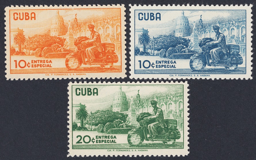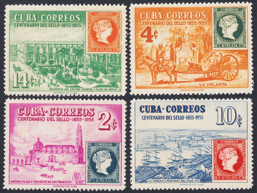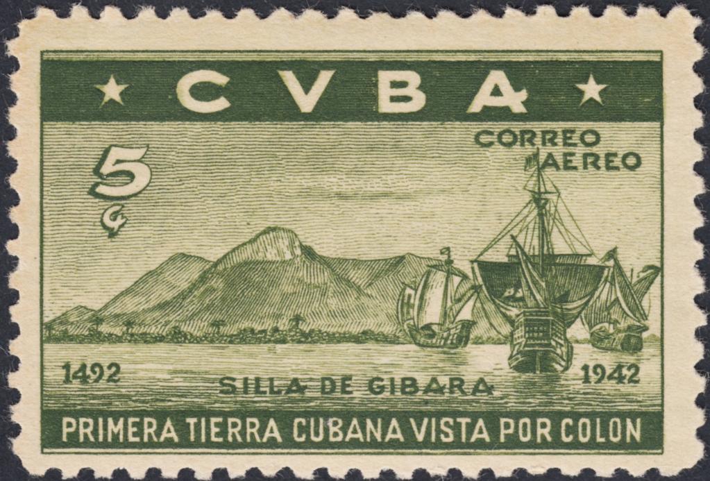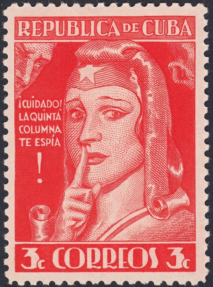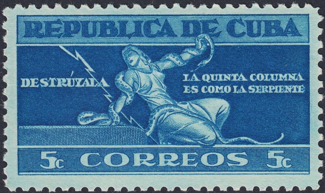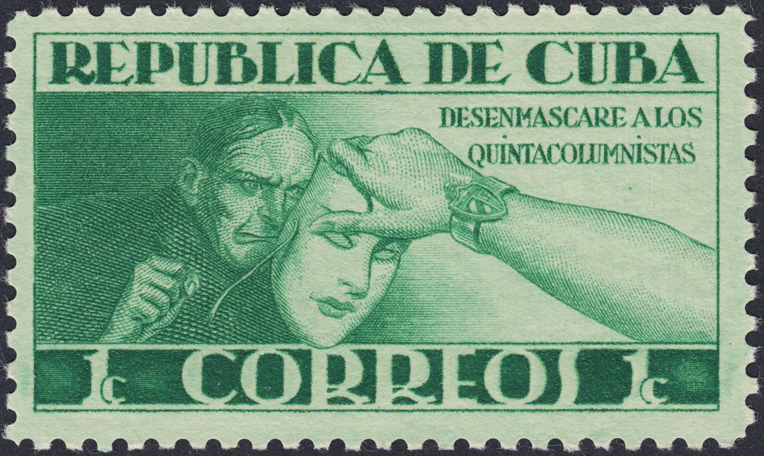 Pero ¿y Cuba? Entre los años veinte y mitad de los cincuenta, sobre todo, emitieron unas series espectaculares y además muy singulares. En alguno de los sellos pone como pie de imprenta que fueron impresos en Cuba; pero en la mayoría, como en esta serie excepcional que muestro (año 1943, de lucha contra la Quinta Columna y de la que ya mostramos alguna pieza en las primeras páginas), no pone nada, tampoco en la dedicada al descubrimiento de América un año después o en la gran serie de José Martí de 1953; en otros, bien es cierto, como en los que conforman la famosa serie dedicada al centenario de la bandera cubana, pone al pie de los sellos que fueron impresos por la casa inglesa Waterlow & Sons.