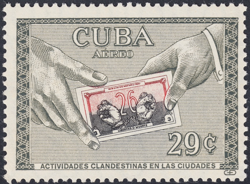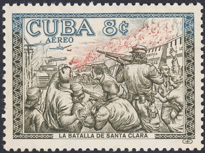 Agrego, para terminar con esta digresión tan sugestiva, un sello del período comentado en las entradas anteriores, con un grabado más convencional, más al uso clásico aún con el inevitable y delicioso toque cubano en marco y letras, y cuatro sellos del período posterior, ya en los primeros años triunfales de la revolución. El primero corresponde al líder revolucionario Antonio Guiteras (1906-1935); los tres últimos, de 1963, están dedicados a Hemingway, tres sellos excelentes, uno de ellos de impresión calcográfica (13ct), los otros dos de impresión mixta, calcografía y litografía.