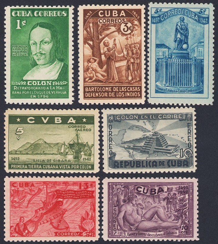 Agrego la serie referida del Descubrimiento de América. Serie calcográfica excepcional emitida por Cuba en mayo de 1944, consta de los siete sellos que mostramos en la primera imagen. Ampliamos cuatro debajo: todo un regalo para los sentidos. Más adelante dedicaremos algunas entradas a analizar al detalle varios de ellos, vale la pena deleitarse con la belleza barroca de esta gran emisión.