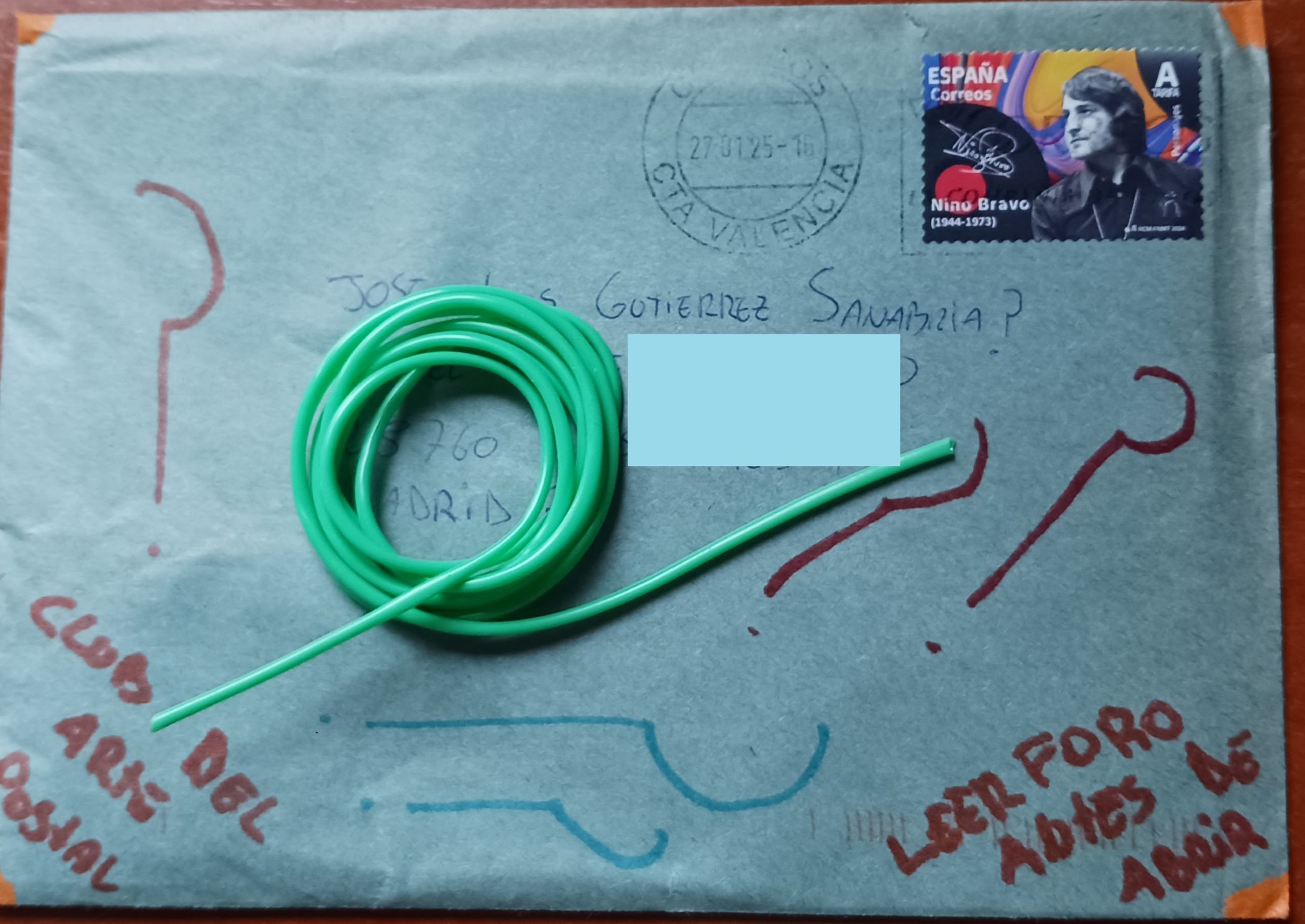 A la espera de que nos confirmen y comenten sus recepciones Charlie, Rafael y Juan, vamos a analizar el patrón hasta ahora. Parece que se puede deducir que estos 'sobres sorpresa' contienen (como en el caso de José Luis y el mío) una postal y un cablecito de plástico. A Paco no le llega nada porque se lo han robado. Y Raúl dice que solo le llega la postal, pero a la vez nos comenta y muestra cómo su sobre está abierto por una esquina y luego pegado con celo. Es cierto que el cablecito de plástico hacía bulto en el sobre y que, cuando se palpa el sobre, cualquiera puede pensar (yo mismo lo he hecho cuando lo recogí del buzón): "coño, aquí va algo", pues se notaba el relieve. Pues ahora a mí me da que el sobre de Raúl también llevaba un cablecito de plástico, que su cartero lo ha sacado del sobre por una esquina que abrió, y que luego pegó ese cacho de celo que hemos visto.