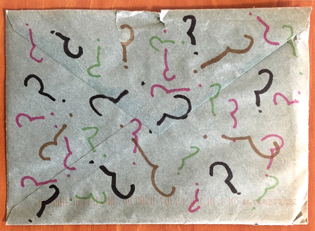 Se añade ya a mi colección de Arte postal, en la que esos sobres adelgazados y de colores suaves, y a veces redecorados, como en este caso, con esos signos de interrogación "casi infantiles" le están dando un toque muy original. Gracias, Raúl.
