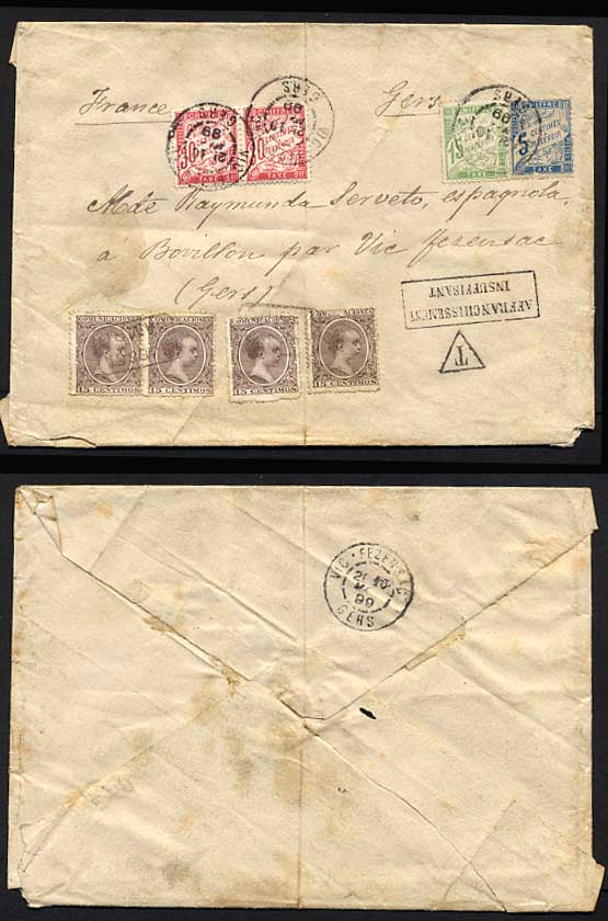 Efectivamente, amigo Buzones, yo la tuve en seguimiento y también me percaté del "raro" franqueo. Sin embargo la duda que tengo es sobre el fechador de Nuremberg que se ve en el reverso de la faja.No es 1899;creo que es 1896,pero bien podría ser 1898 por estar el "8" parcialmente estampado. En cualquiera de los dos casos no puede ser el 10 cts bermellón ,que se emitió en 1899. Debería ser el 10 cts castaño amarillento (nº 217). Si no es así ,¿podría ser una manipulación ? ¿errónea percepción del color de la imagen? ¿error del fechador?