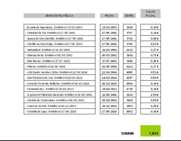Las 10 emisiones hasta aquí referenciadas, suman 10,98€. Falta por reseñar la última emisión citada en la web de Correos,correspondiente a Felipe VI (Año 2015).Si realmente el valor facial de las emisiones incluidas,es de 12,98€.;cabe deducir que de la serie básica únicamente se incluye el sello con valor facial de 2,00€.Indicar que no he revisado las emisiones filatélicas correspondientes a Asturias; es decir, si están todas o falta alguna.