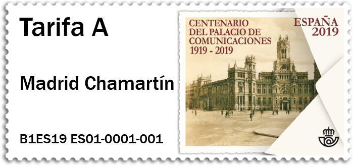 Etiqueta Franqueadora ATM. Madrid Chamartín. 2019-1. Centenario del Palacio de Comunicaciones 1919-2019. Tarifa A. B1ES19 ES01-0001-001. Boceto.jpg