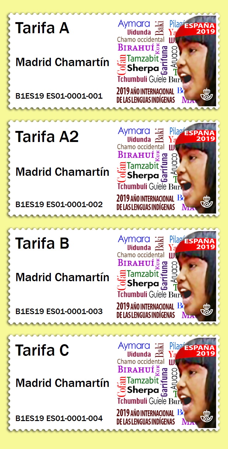 Etiqueta Franqueadora ATM. Madrid Chamartín. 2019-2. Año Internacional de las Lenguas Indígenas. Juego de 4 tarifas. B1ES19 ES01-0001-001 a 004. Boceto.jpg
