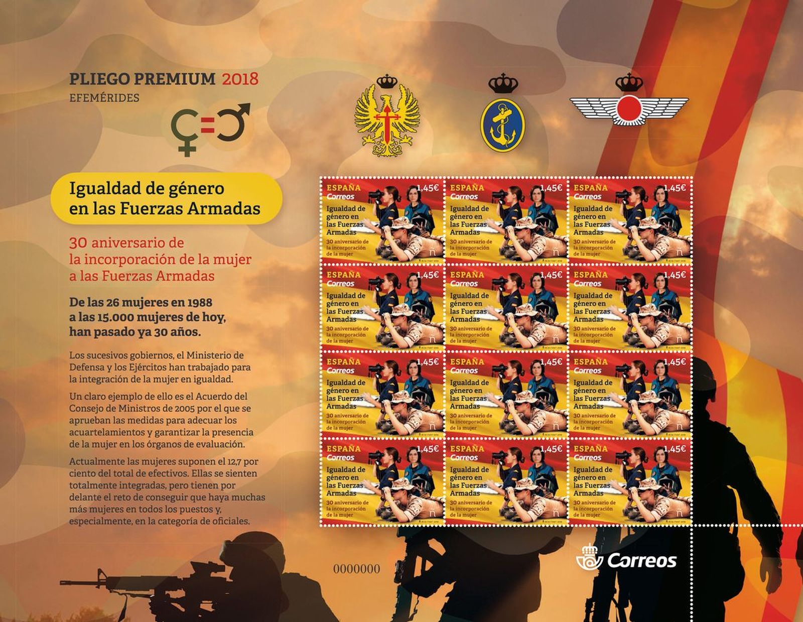 Correos ha querido sumarse a la celebración de los treinta años de la incorporación de la mujer en las Fuerzas Armadas emitiendo un sello en el que se recoge la imagen de tres mujeres representando cada una de ellas a un ejército en situaciones de labores militares, todo bajo la bandera de España. El sello se presenta en pliego Premium donde además de estos elementos aparecen los emblemas de los tres ejércitos y un fondo de indumentaria militar.