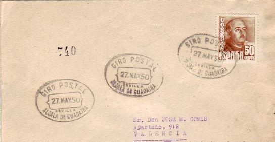 El matasello de giro postal es del año 1950 lo veo correcto. La Orden del Ministerio de Hacienda de 24 de diciembre de 1949 habilitaba estos sellos para el franqueo ordinario , tuvo validez hasta finales de ese año y después se restringe a la correspondencia del servicio interior