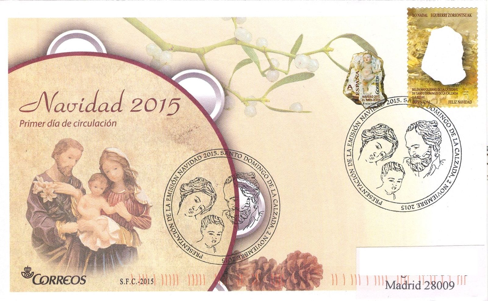 Y como muestra de la presentación del sello dedicado al "Niño Jesús", sello de Tarifa A, dentro de la serie "Navidad - 2015" que se emitió el pasado 2 de noviembre, realizada el pasado día 11 de diciembre en la Catedral de Santo Domingo de la Calzada, reproduzco el matasellos de presentación que allí se empeló y, especialmente, el sobre que repartió Correos (con el detalle de la figura del Níño separada de su soporte) y que lo he obtenido gracias a un buen amigo riojano.