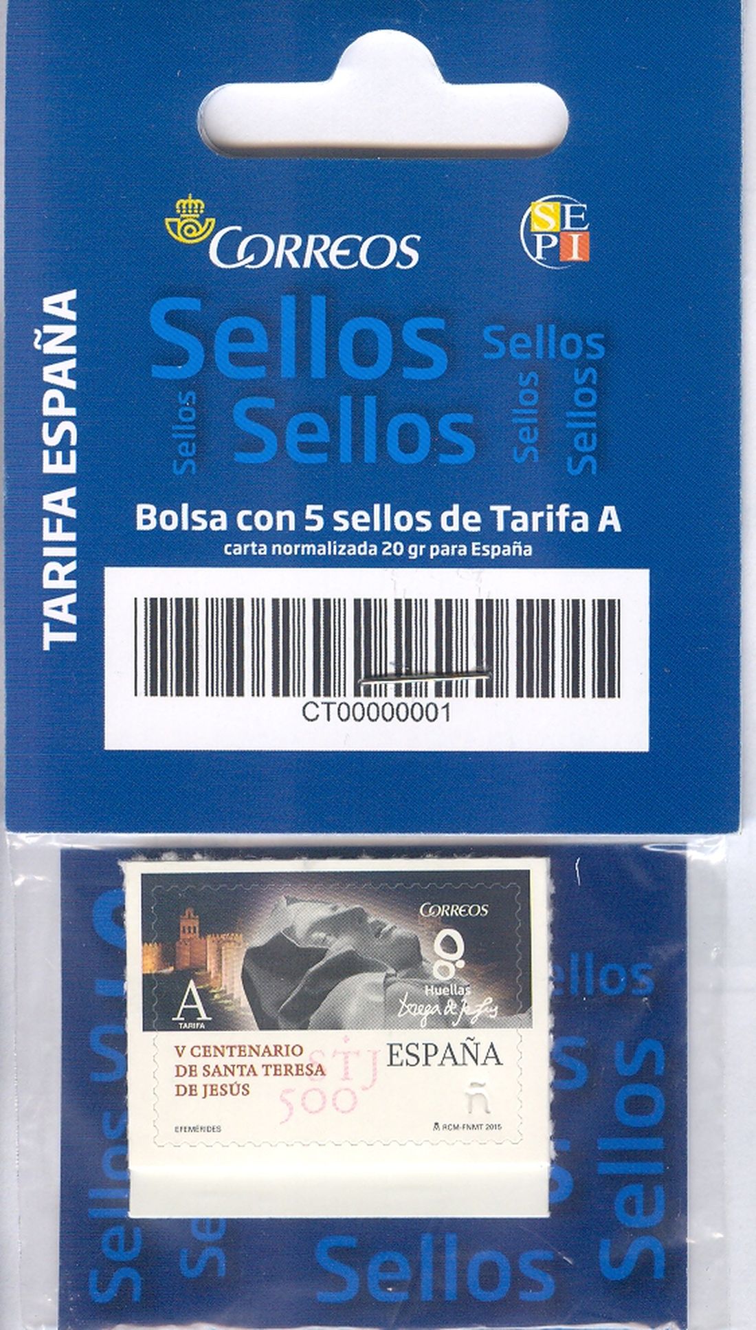 Bolsita de 5 sellos, vendida a la fecha actual a un precio de 5,75 euros.