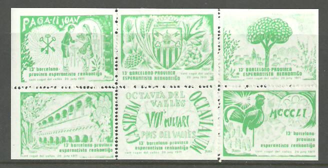 Os dejo unas viñetas esperantistas de PINS del VALLES (hoy dia San Cugat el vallés)...no tengo mejor imagen pero debe de ser de 1937-1938, ya que en esa epoca la poblacion cambia el nombre por motivos de guerra por el de Pins del Valles.,,,,aunque parece poner 1971 (tal vez sea una conmemoracion)