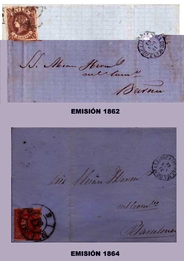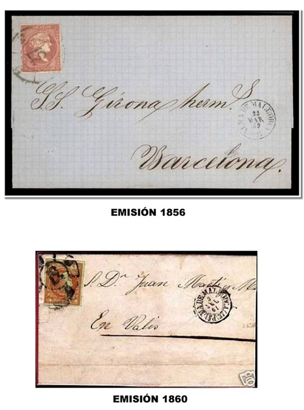 Para no dejar viudo de imágenes este comentario, dejo unas de la misma Administración anterior Palma de Mallorca y que son sobre las emisiones de 1856 - 1860 - 1862 -1864 y 1865. Es decir, todas las emisiones sobre las que se usó la rueda ya que a continuación se usó la parrilla cifrada en la siguiente emisión. La de 1862 no es muy buena pero es lo que hay y hasta que no encuentre otra... pues eso. También faltaría para estar "completa" pero que es una emisión anterior al matasellos, la emisión de 1855 que se usó para Servicio Oficial.