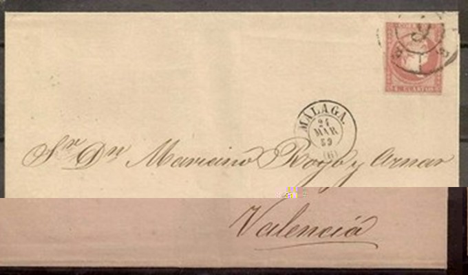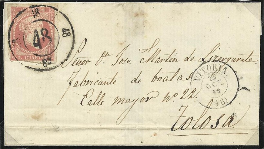 Hoy quería mostrar una de mis recientes adquisiciones, removiendo internet y encontrada nada menos que en Alemania. Se trata de una carta (envuelta) con el 48 de Vitoria sobre el 48 rojo, lo verdaderamente interesante es la fecha... 15 de octubre de 1858, es decir, primer día de uso oficial del matasellos en España.