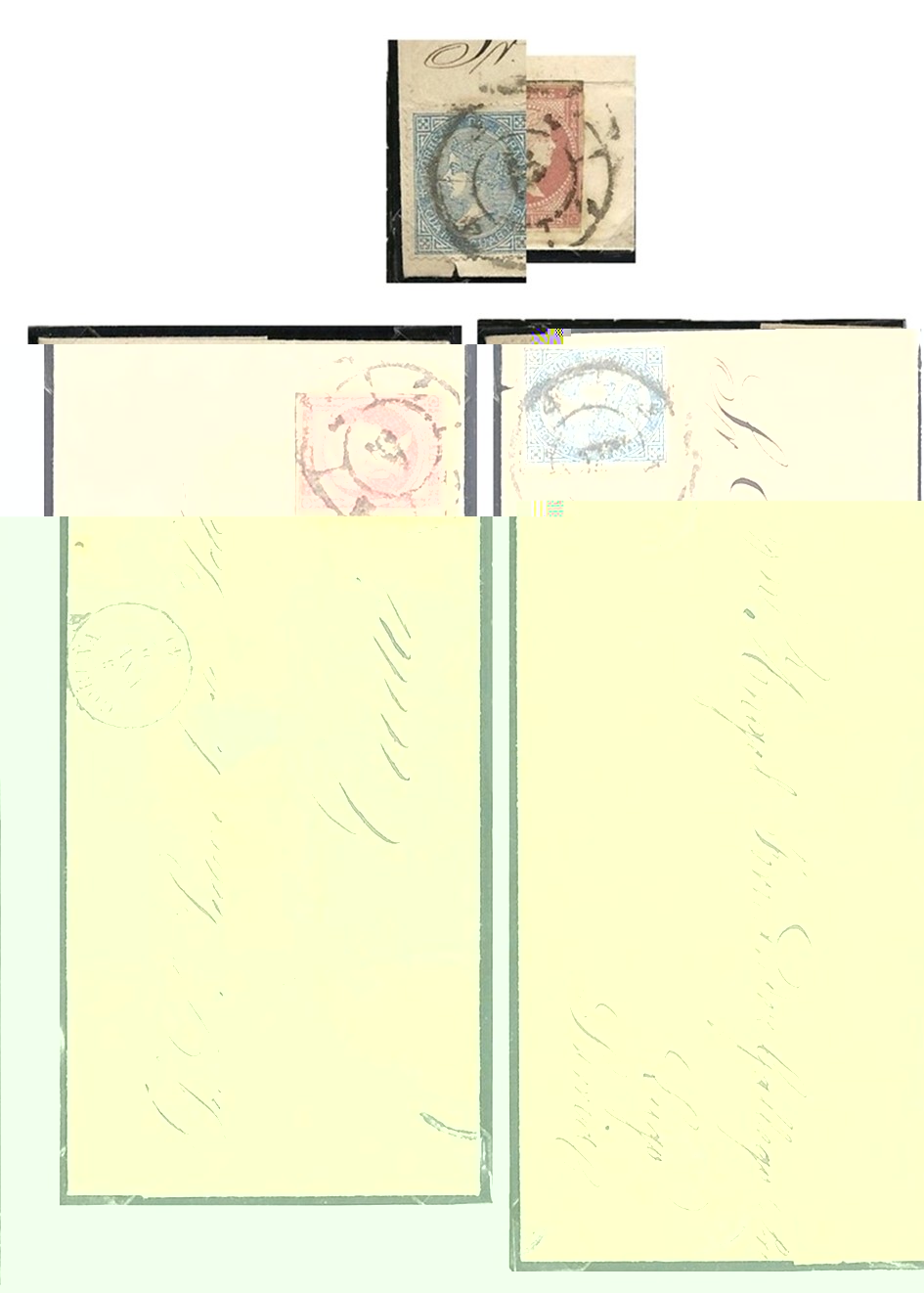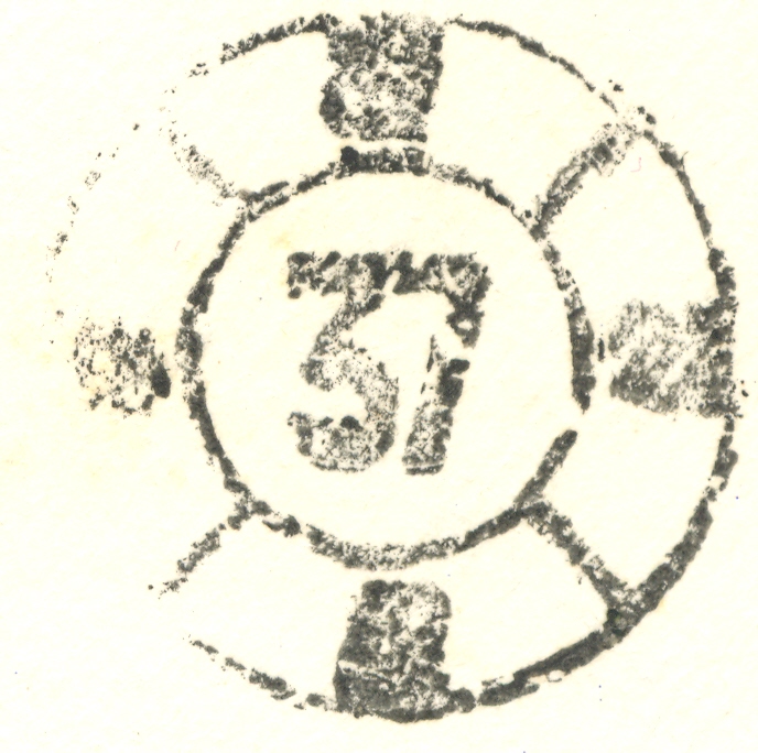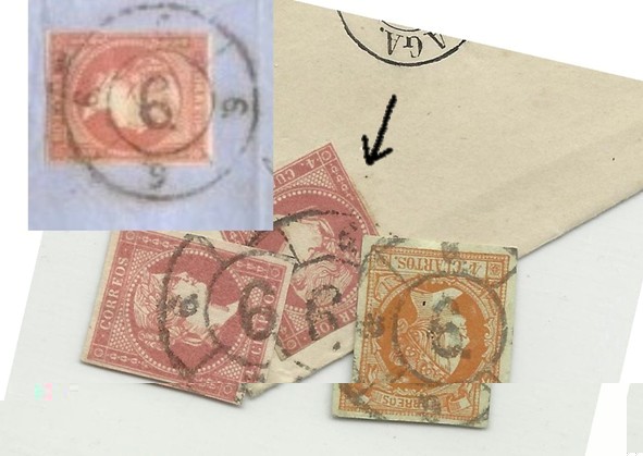 Hoy me gustaría comentar esta carta que tengo hace cierto tiempo y ver que opinan l@s demás forer@s. A simple vista se observa que el numeral central es algo diferente y que recuerda en cierta manera al de la modificada de 1865 en su parte superior pese a ser algo mas ancha. También dicho numeral no esta perpendicular al numeral exterior superior mas pequeño, el inferior y que también podría servir de referencia quedó fuera de la carta lo que es una pena. He adjuntado otra foto con una ampliación del sello matasellado junto a otros para que se puedan observar las diferencias.