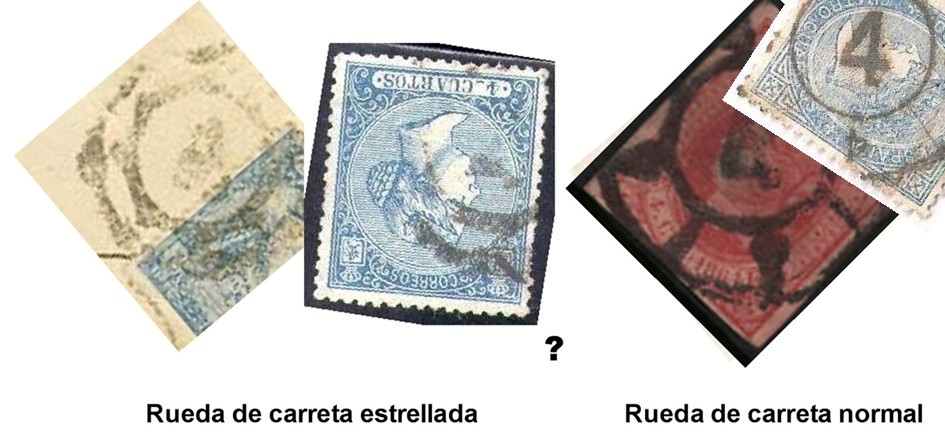 De las Ruedas de carreta de Málaga, he observado que normalmente la tinta usada para estamparlas es de un tono de color diferente (más grisáceo) al tono negro del fechador, al menos en las que tengo sobre el 4 cuartos amarillo. Saludos.