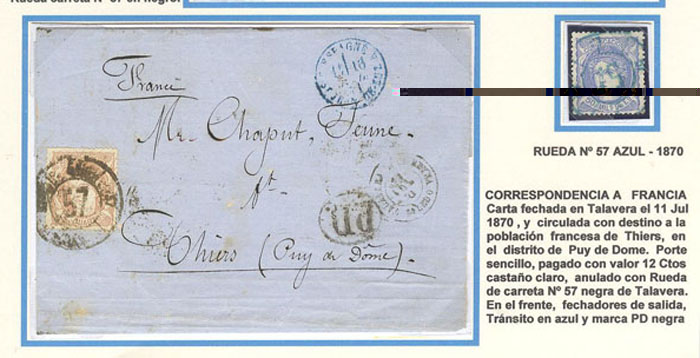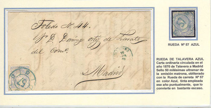 La 57 de Talavera, tiene reconocido y confirmado su uso hasta 1871 con toda asiduidad, es más, en 1870 se estampó en dos colores, negro y azul.