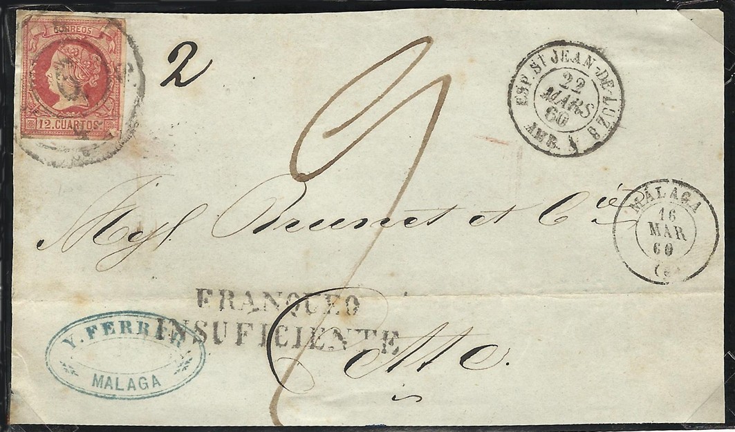 Se trata de 2 cartas, una de ellas frontal (Málaga) dirigidas a Francia, pero que tienen la peculiaridad de estar mal franqueadas (doble porte) y por eso lo de las marcas de "franqueo insuficiente. La de Santander que por cierto la "rueda" no es muy buena sino mas bien todo lo contrario :x lleva las marcas por duplicado y de diferentes oficinas.
